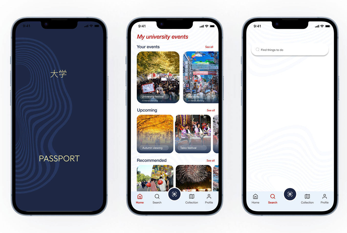 Personalized experience with passport colors matching your home country. Search for events and filter by interests, location, and date. The search functionality makes it easy to find exactly what you're looking for.